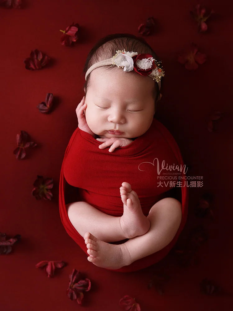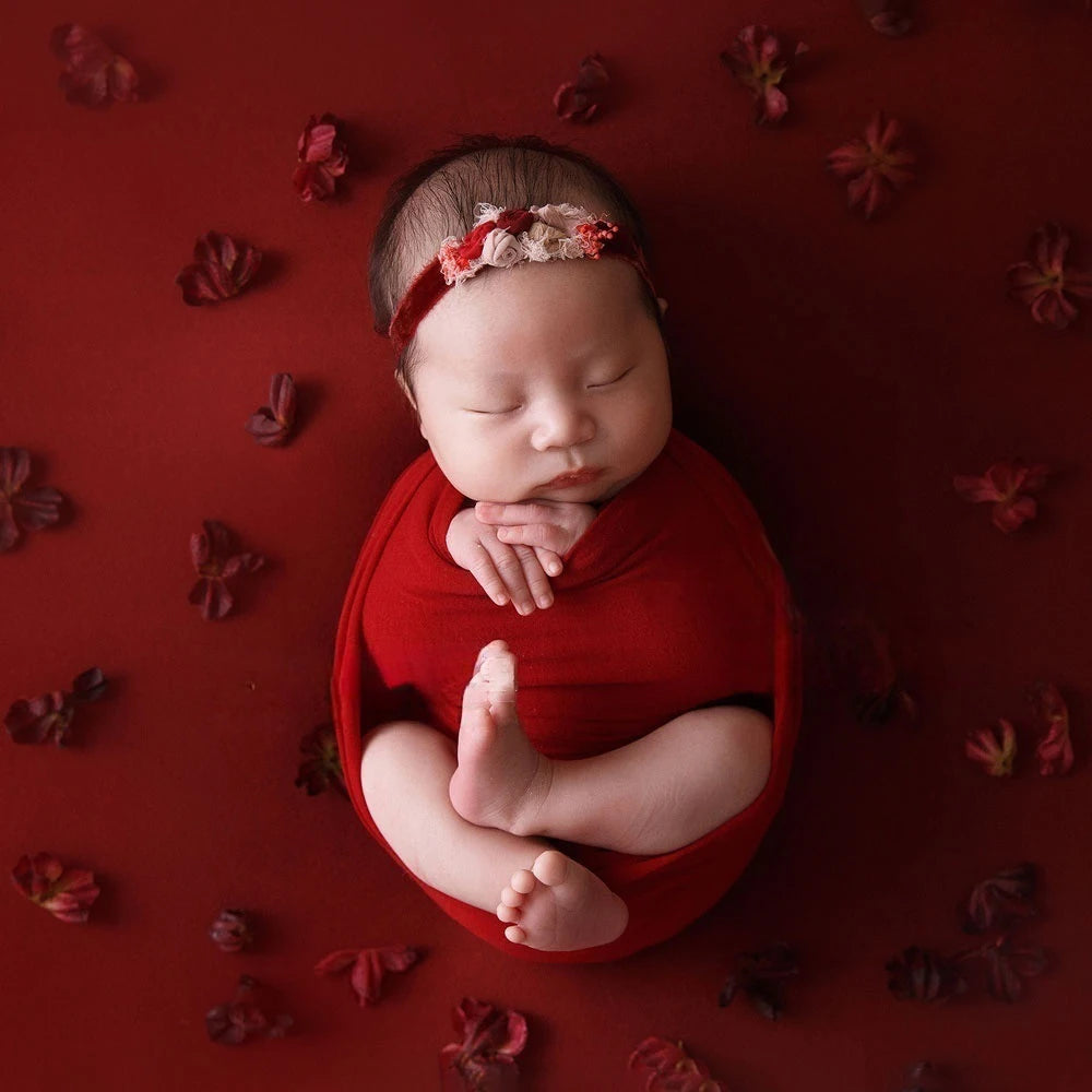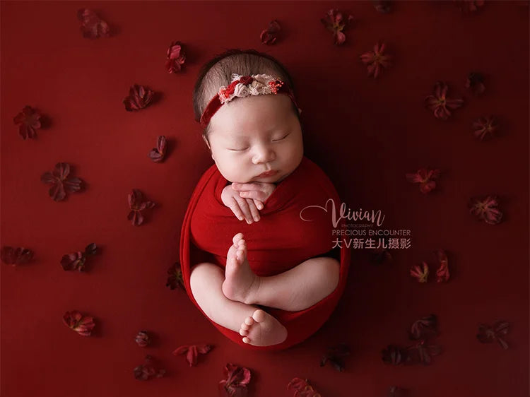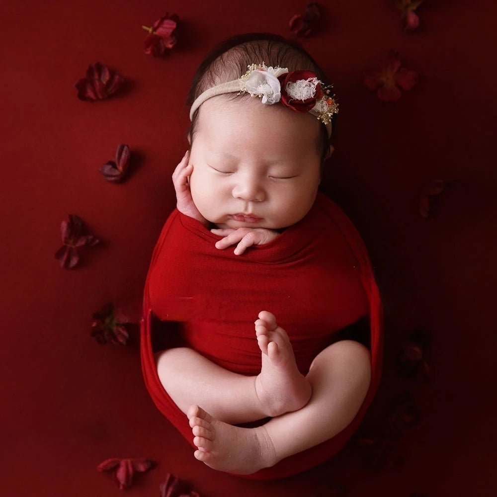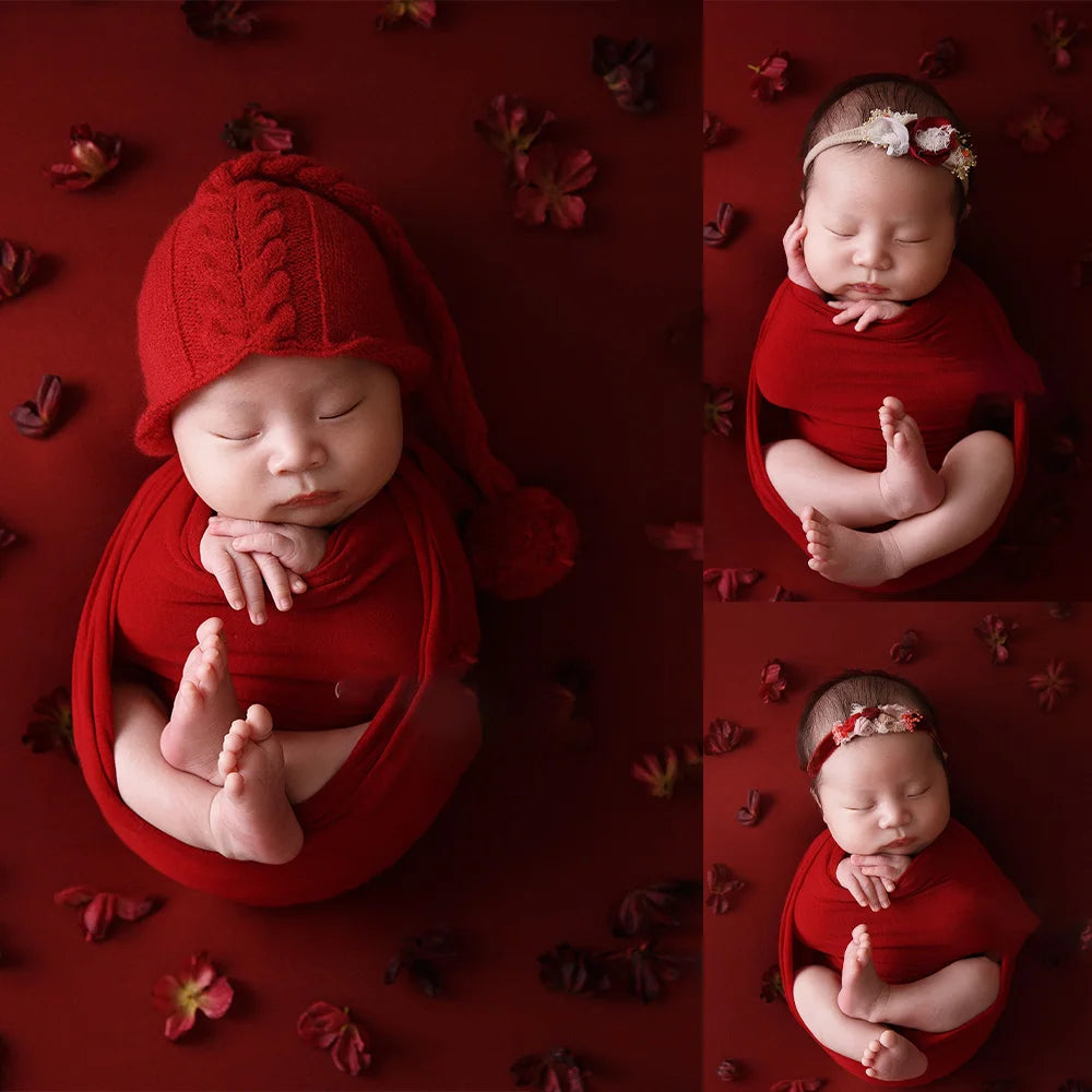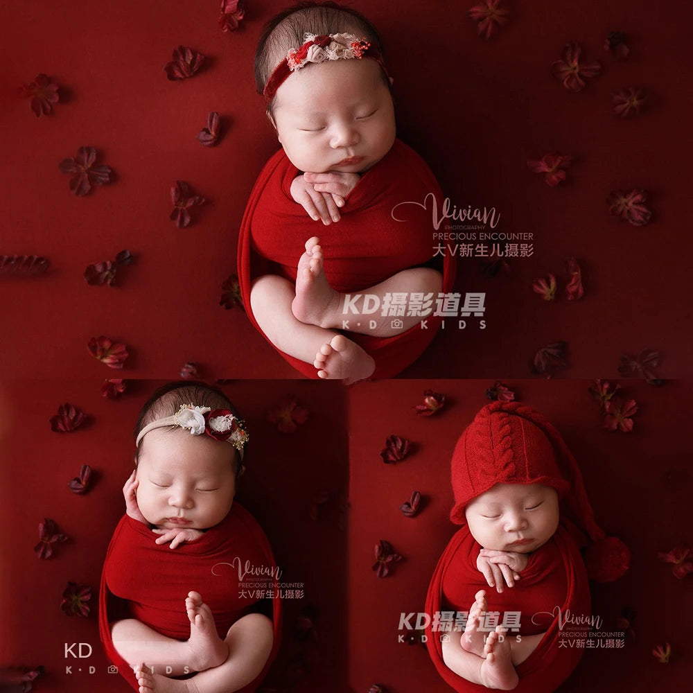 6pcs/Set Newborn Photography Props Soft Stretchable Baby Swaddle Wrap Headflower Red Theme Studio Infant Photography Accessories
